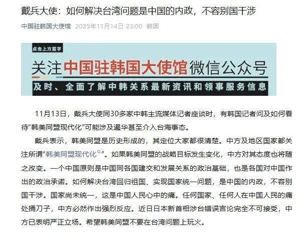 据“中国驻韩国大使馆”微信公众号消息,11月13日,戴兵大使同30多家中韩主流媒体记者座谈时,有韩国记者问及如何看待“韩美同盟现代化”可能涉及遏华甚至介入台海事态。戴兵表示,韩美同盟是历史形成的,其定位大家都很清楚。中方及地区国家都关注所谓“韩美同盟现代化”。如果韩美同盟的战略目标发生变化,中方对其态度也将随之改变。